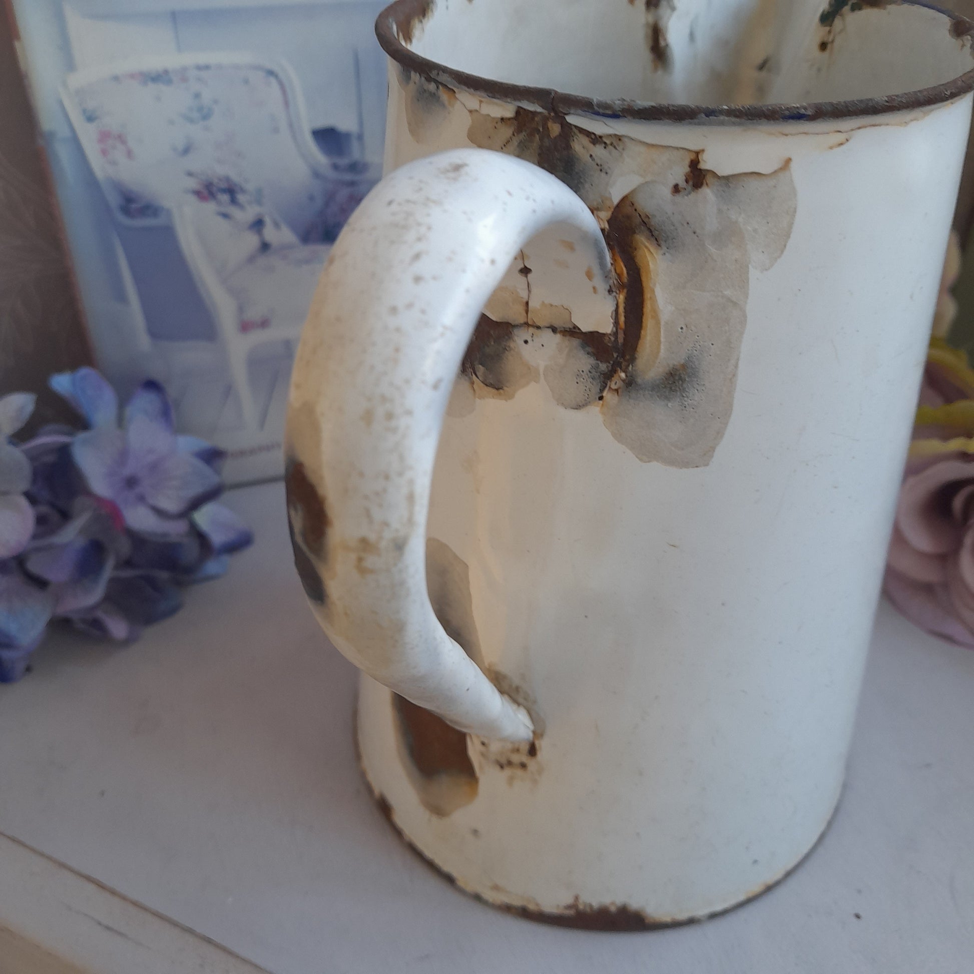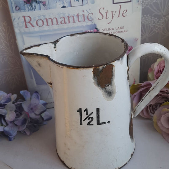 Darling well loved rustic white enamel 1 1/2 L measuring jug brought back from France so a real French farmhouse brocante aesthetic. Black edging. Measures 7 inches tall. Well used with lots dinks & rusty bits which simply adds to the character. Perfect vase.