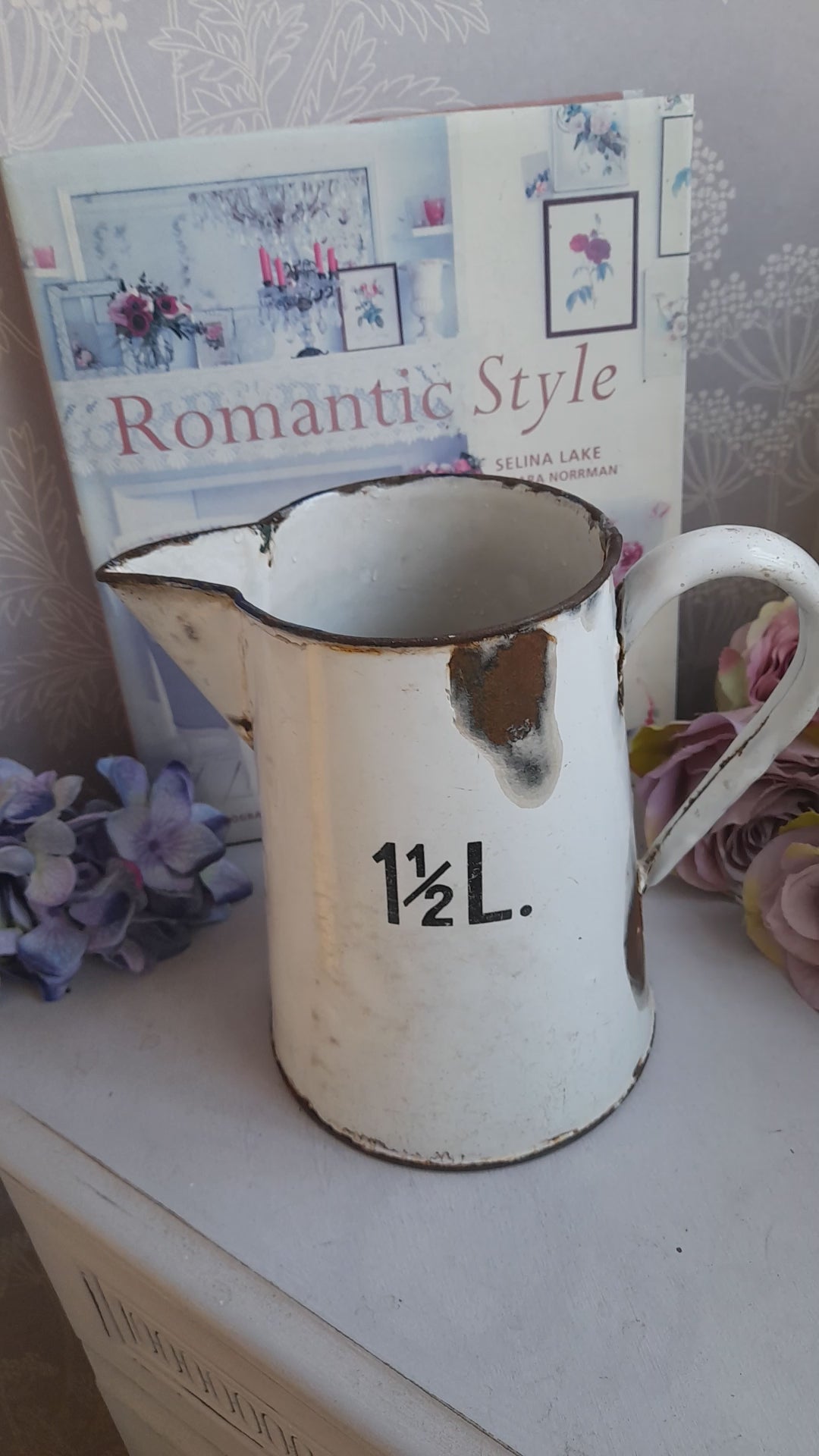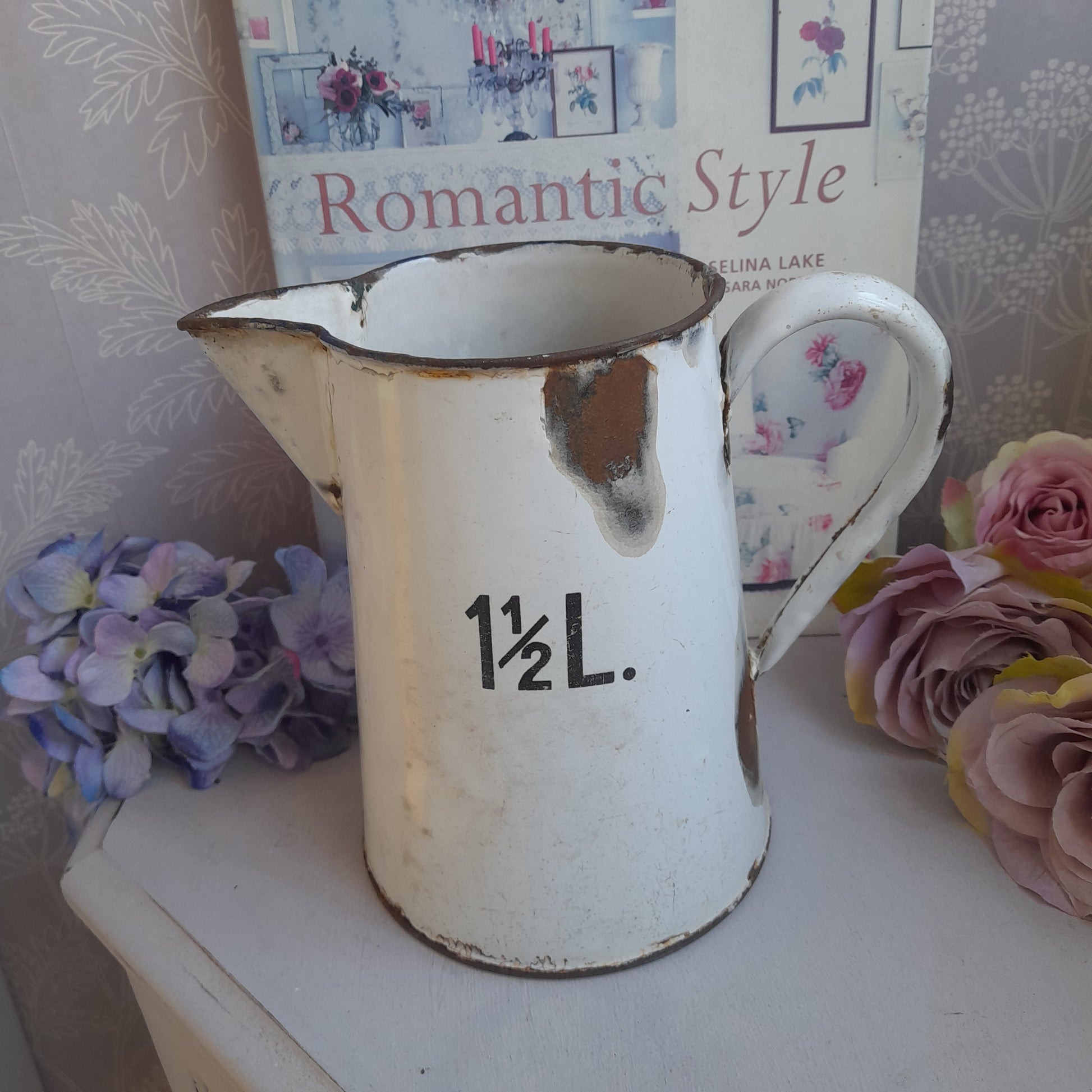 Antique White Enamel Measuring Jug: French Farmhouse Vase