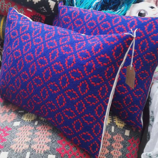 Pair of Cushions in Navy Blue & Red Handmade from Vintage Welsh Tapestry 14" x 18"