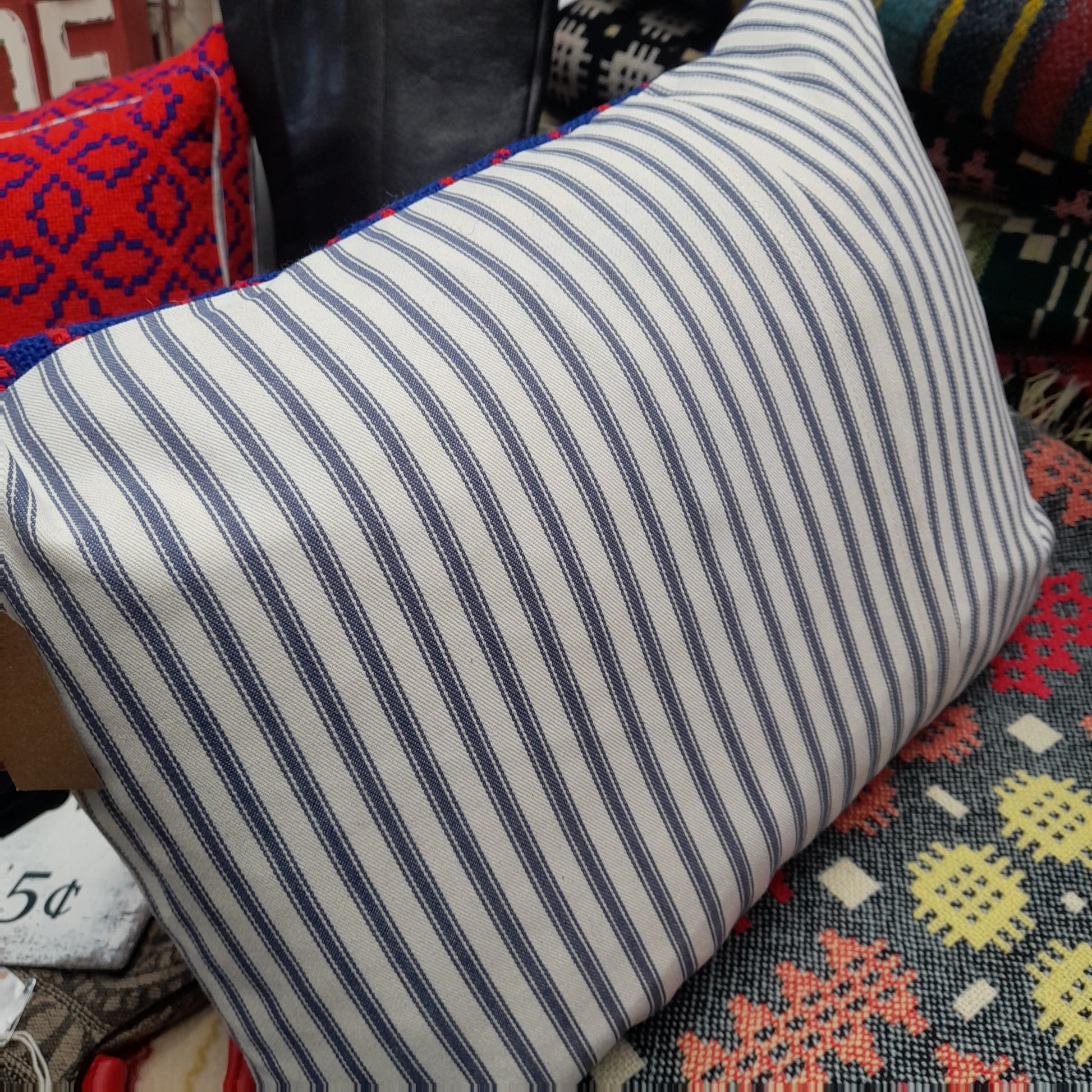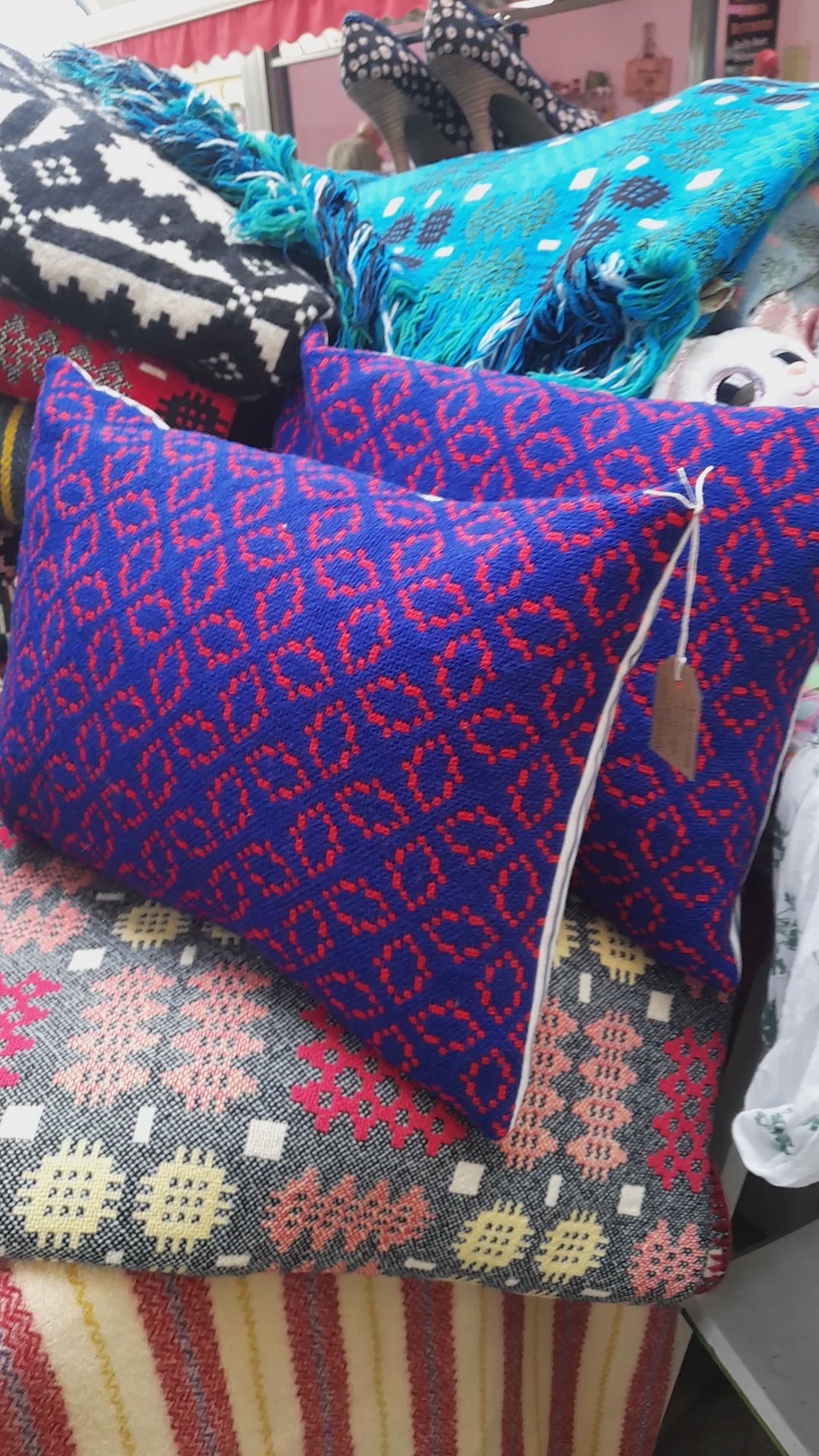 Stunning pair of navy blue & red Welsh wool tapestry cushions handmade from my stash of Welsh blanket fabric I've collected over the years. Size approx 14 inches x 18 inches with quality duck feather inserts. Traditional Welsh ticking navy stripe to back in an envelope fold so no uncomfortable zips. (See the other set with the reverse colour of navy on red available separately). Happy to sell as singles for £39 each just DM me. Would make a perfect gift.