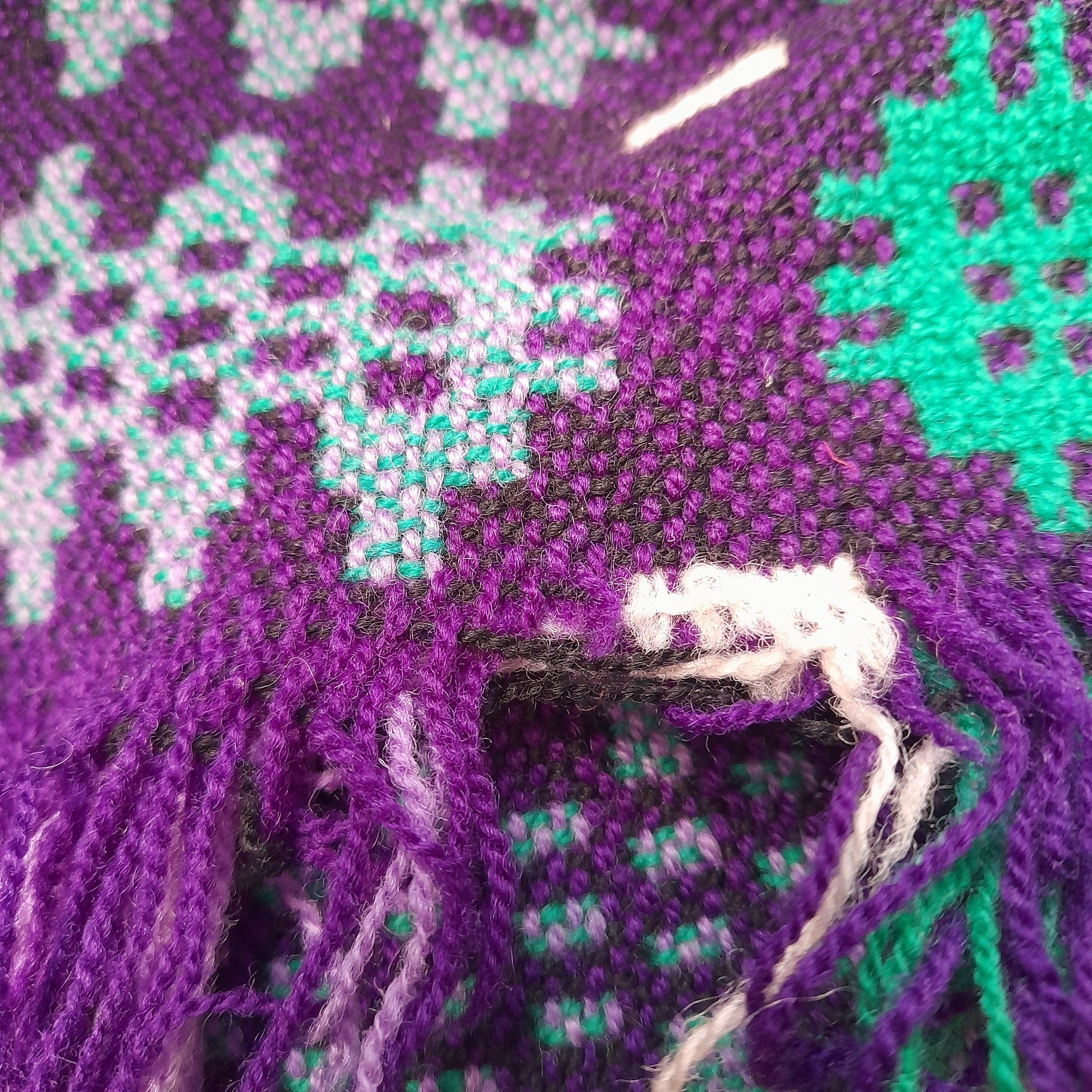 Stunning vintage Welsh wool tapestry blanket in beautiful dark purple, lighter lilac & a pop of teal green. Traditional portcullis Caernarfonshire design c1960s. Good condition but has lost approx inch of fringe but you'd have to look hard to see it. Measures approx 99 inches x 69 inches.