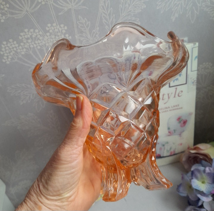 Stunning vintage Sowerby Pink Blush Footed Glass Vase by Ellison Glass Works Ltd. Lovely Flower Bowl with Scalloped Raised Rim. Sowerby Design C2583. Great shape. Measures approx 6 inches tall x 7 inches wide at the top. This is a vintage item but in good condition for age