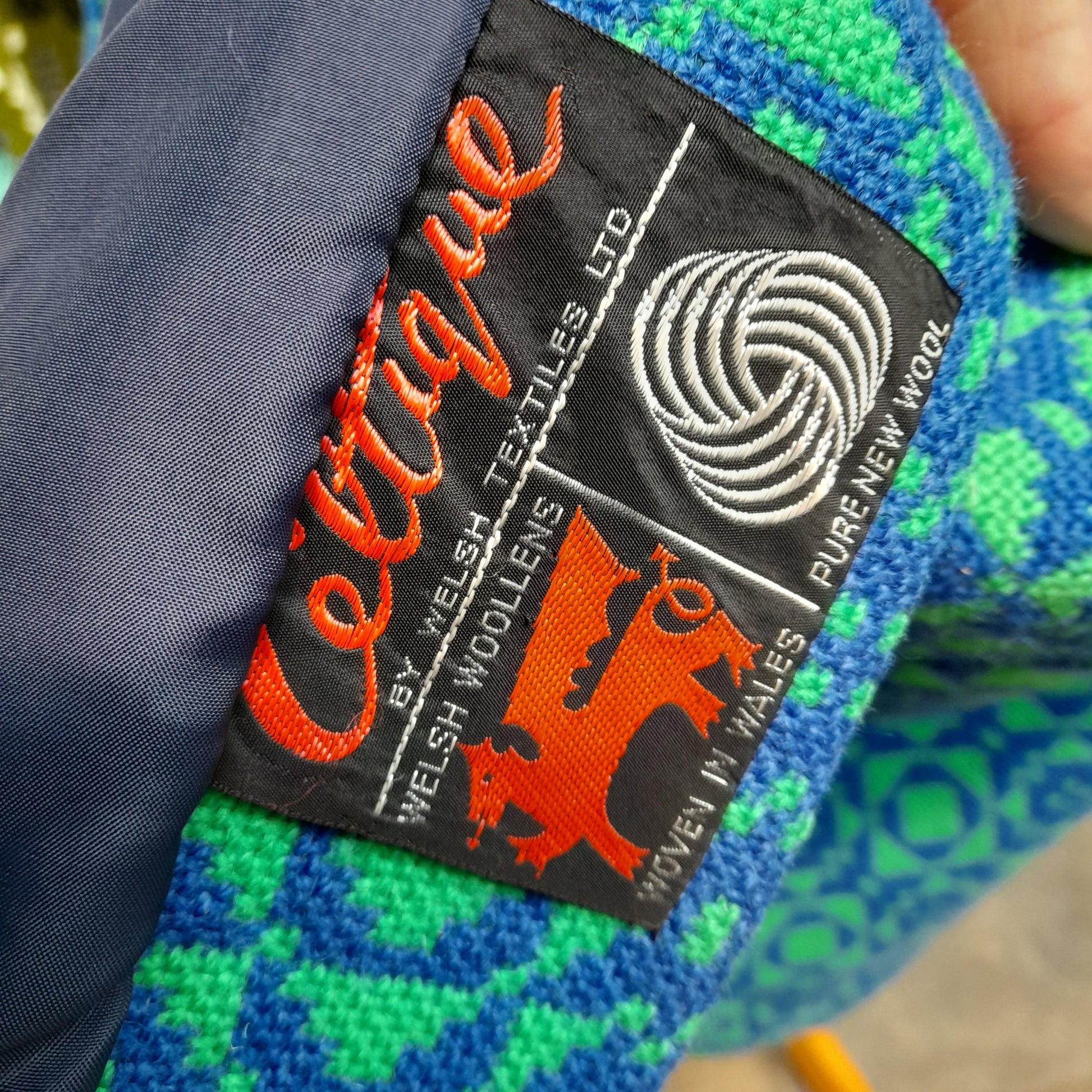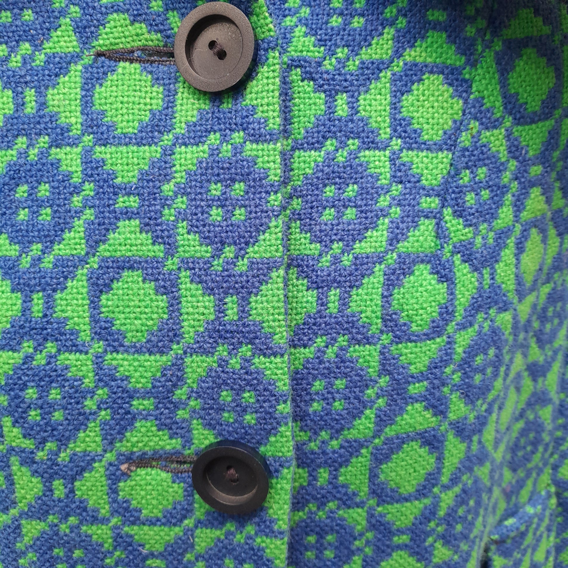 Beautiful vintage Welsh wool tapestry cape in bright blue & jade green. 1970s unusual full length. Original 'Celtique' label. Great condition. Buttons up front. Slashed open pockets to put hands through each side. Shaped shoulders. Measures approx 18 inches across from one side of shoulder to the other across front. 43 inches from nape of neck down back to hem.