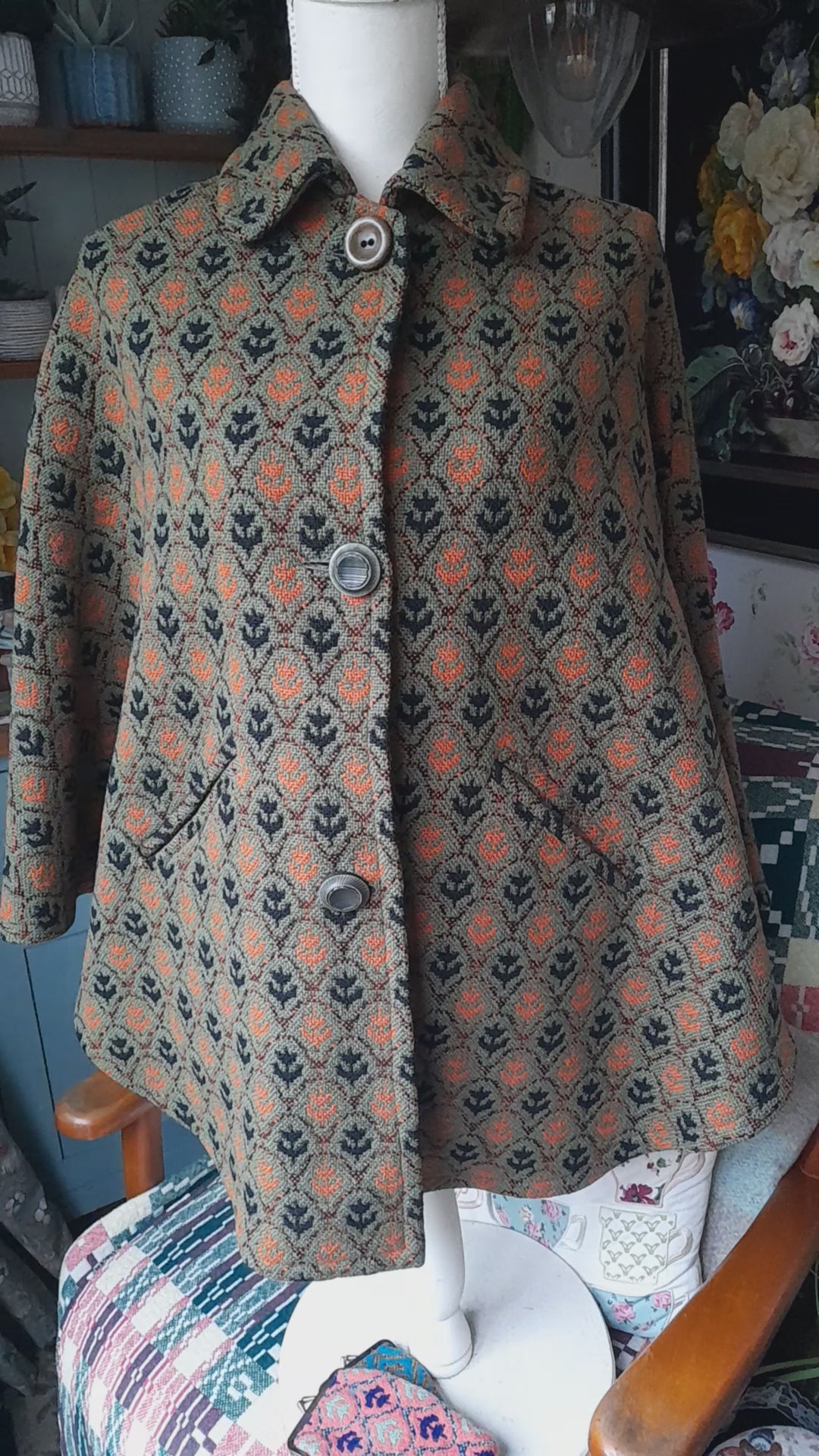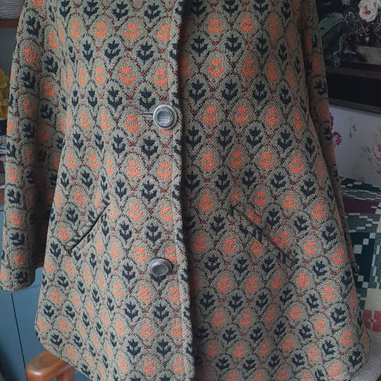 Vintage Welsh Tapestry Cape/Coat in Olive Green, Black & Orange Tulip Design by Brynkir Mill. This design was known as the 'tulip' & was a signature design. Original label still intact. Batwing style cape with buttons up front. Unlined. This mill which was situated in Porthmadog near Caernarfon is sadly now closed. Quite forgiving in terms of the size due to the design but I'd say OK for a size 10 to 16. Lovely condition. Looks to have had one button replaced & is well matched.