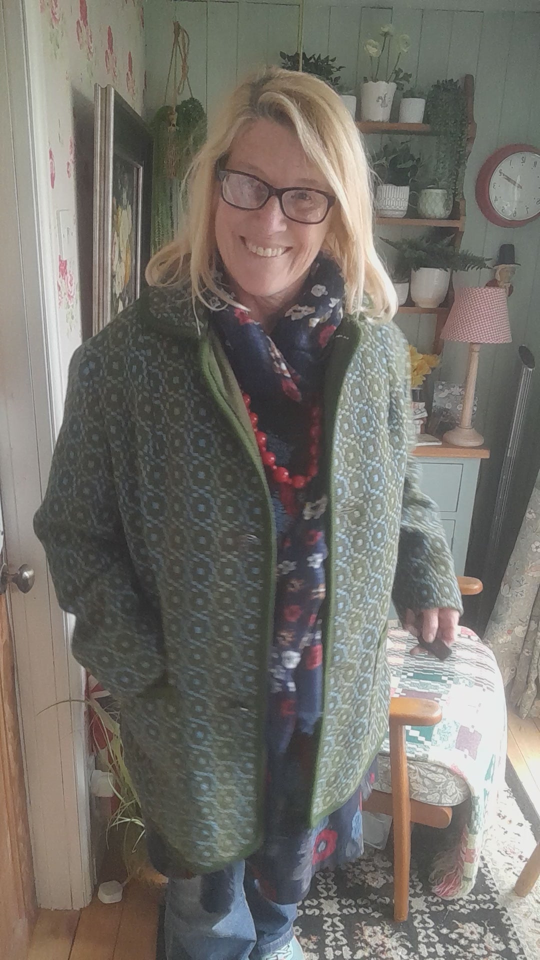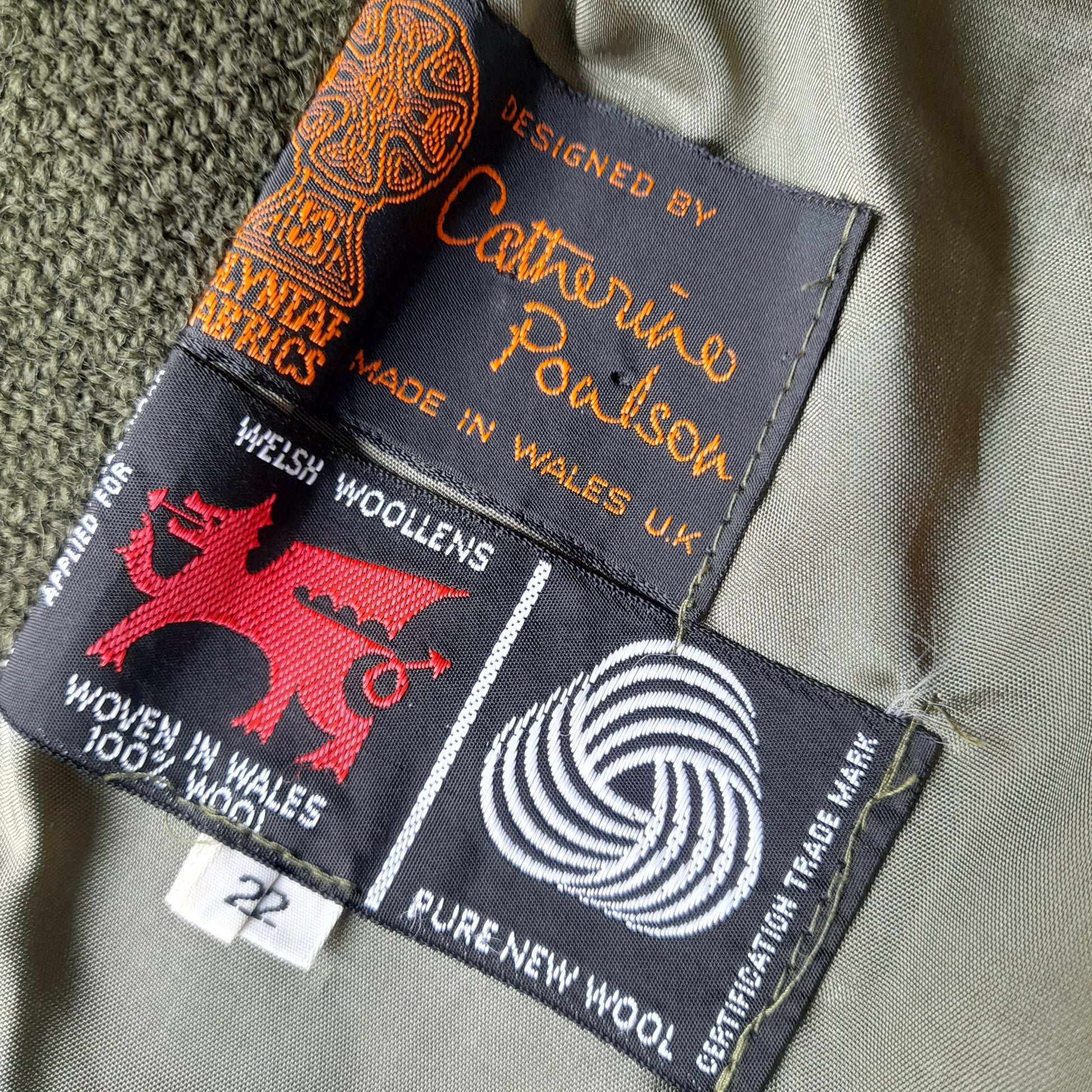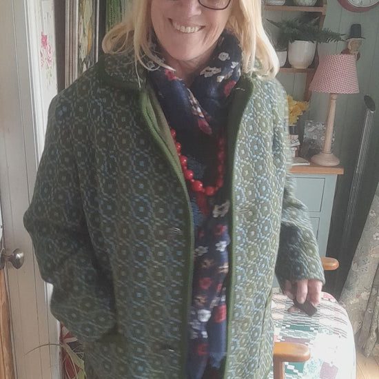Lovely vintage Welsh wool tapestry pea coat in dark teal green design. Two patch pockets to front. Fully lined with original Welsh label. Unusual Welsh dragon buttons. Good condition. Size large 18 to 22.