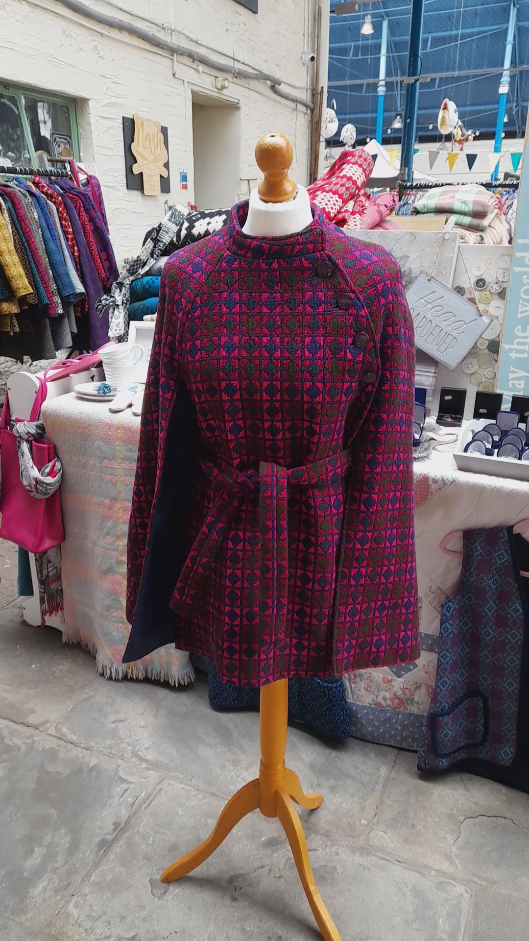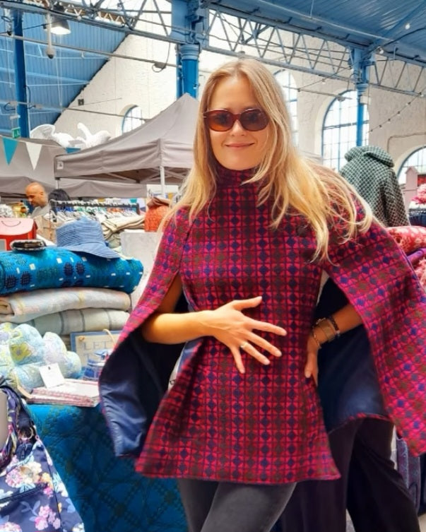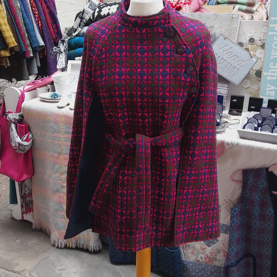 Beautiful 1960's Vintage Welsh wool tapestry cape in vibrant & unusual pink, navy blue & olive green colourway. Buttons up to the side in a 'Dr Kildare' style fashion. Fully lined with original tie belt. In good condition with Welsh label inside