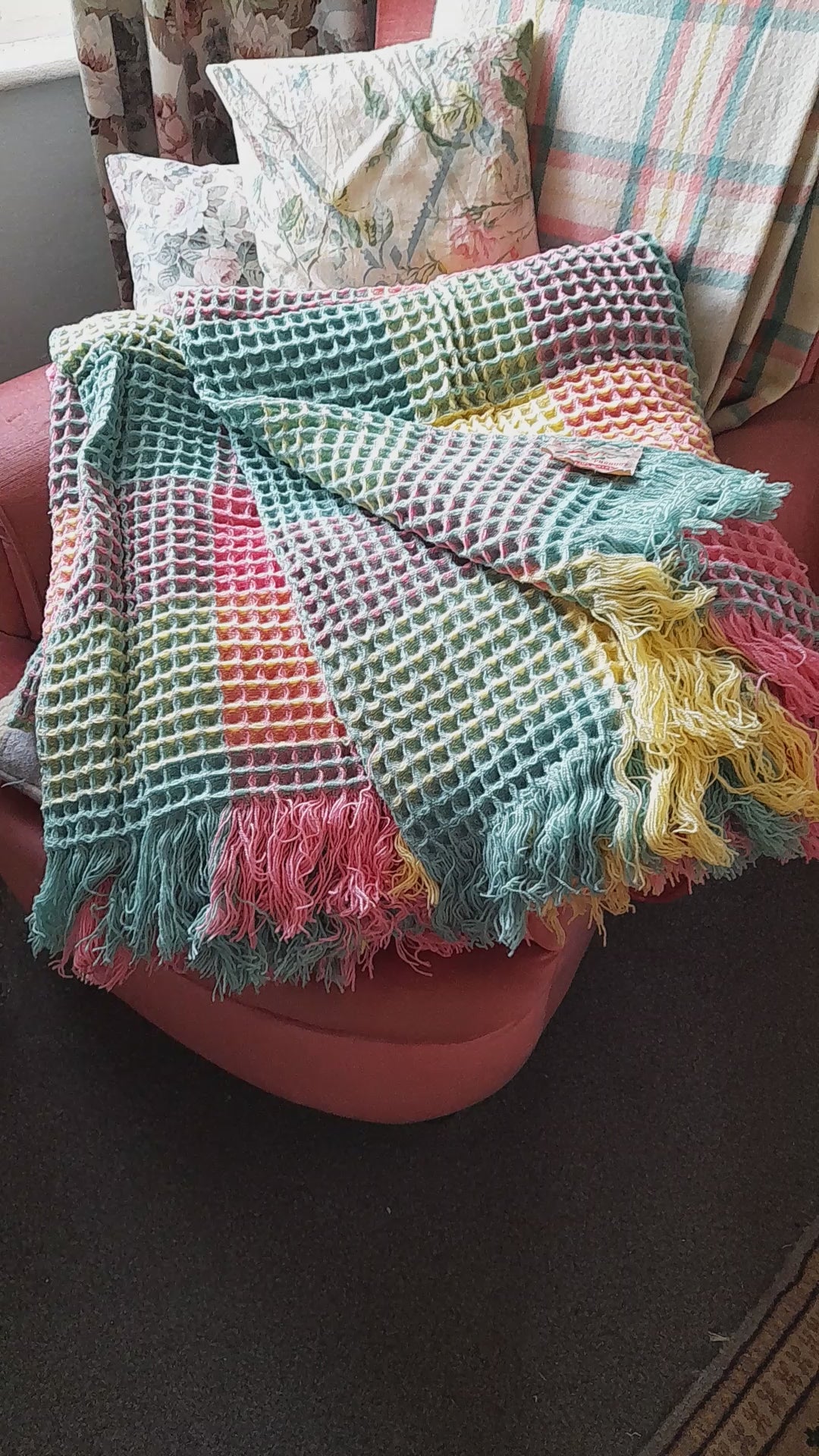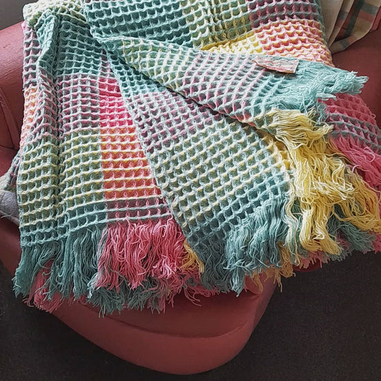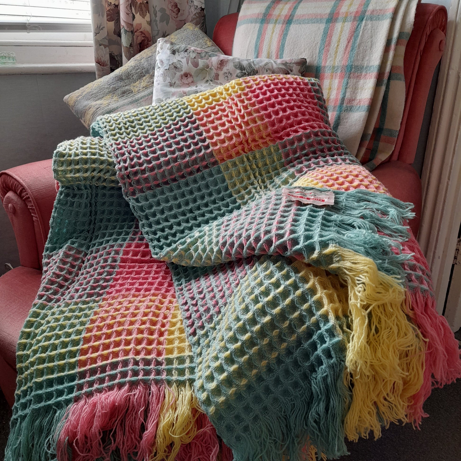 Vintage Welsh Wool Waffle Honeycomb Blanket in Rainbow Colours Pink Green Blue & Yellow by Derw Mill King Size