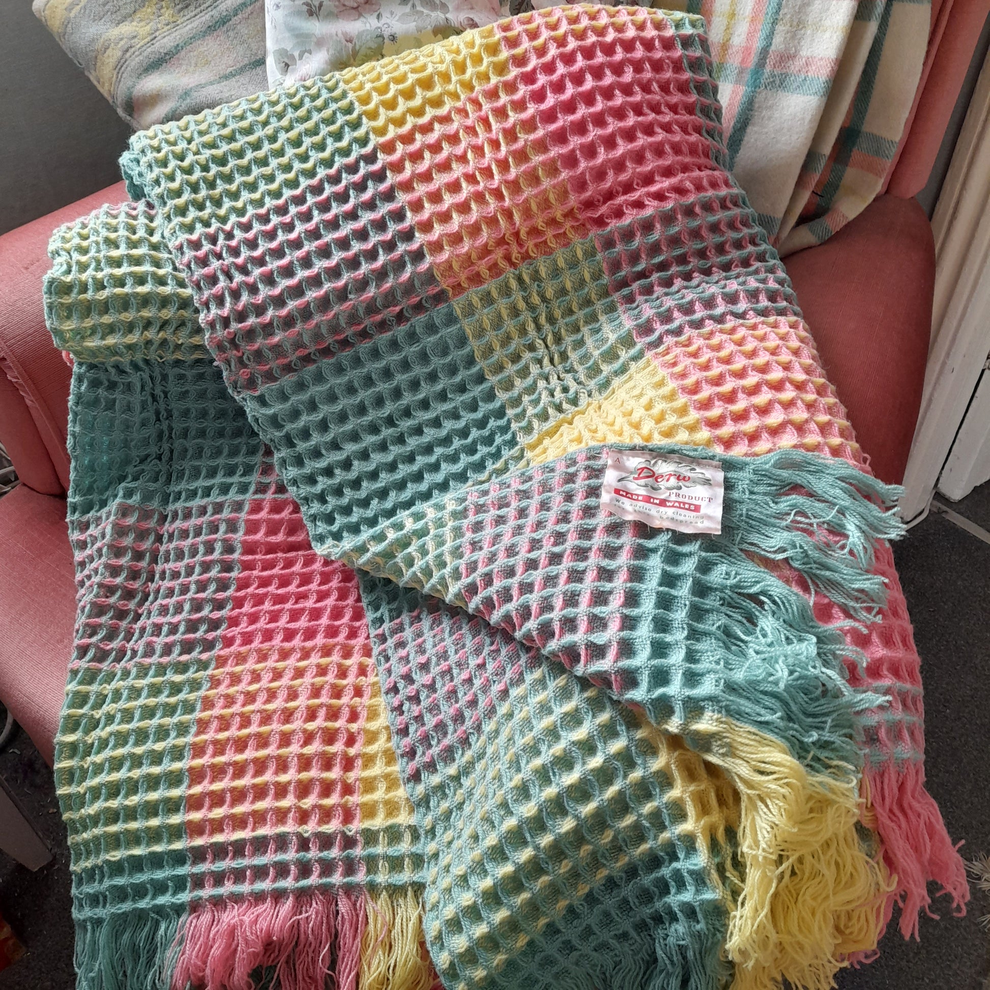 Stunning vintage 1950s Welsh wool waffle/honeycomb blanket in rainbow colours pink, green & daffodil yellow Lovely checked design. Traditional textured weave. Original DERW MILL label. Good condition. Huge King Size. Measures approx 88 inches x 88 inches. So pretty. This blanket is available online only.